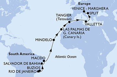 - Rio de Janeiro -> Buzios Brazil -> At Sea -> Salvador Brazil -> Maceio Brazil -> At Sea -> At Sea -> At Sea -> At Sea -> Mindelo Cape Verde -> At Sea -> At Sea -> Las Palmas de G.Canaria (Canary Is.) Spain -> At Sea -> Tangier Morocco -> At Sea -> At Sea -> Valletta Malta -> At Sea -> Split Croatia -> Venice - Marghera Italy