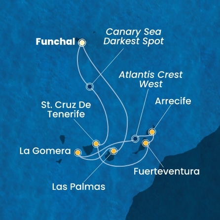 - Funchal (Madeira)->Santa Cruz (Tenerife)->Fuerteventura->Arrecife (Lanzarote)->GOM->Las Palmas (Gran Canaria)->Funchal (Madeira)